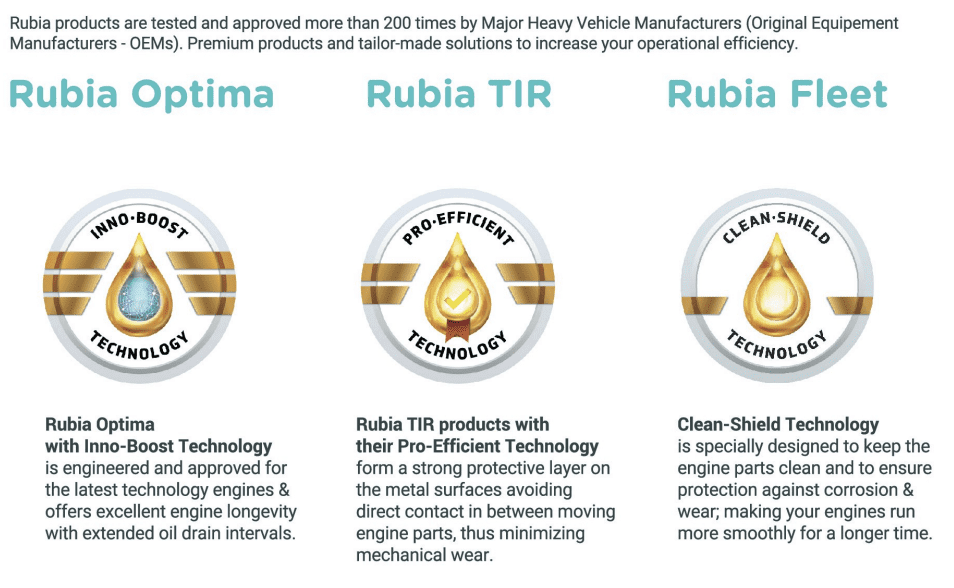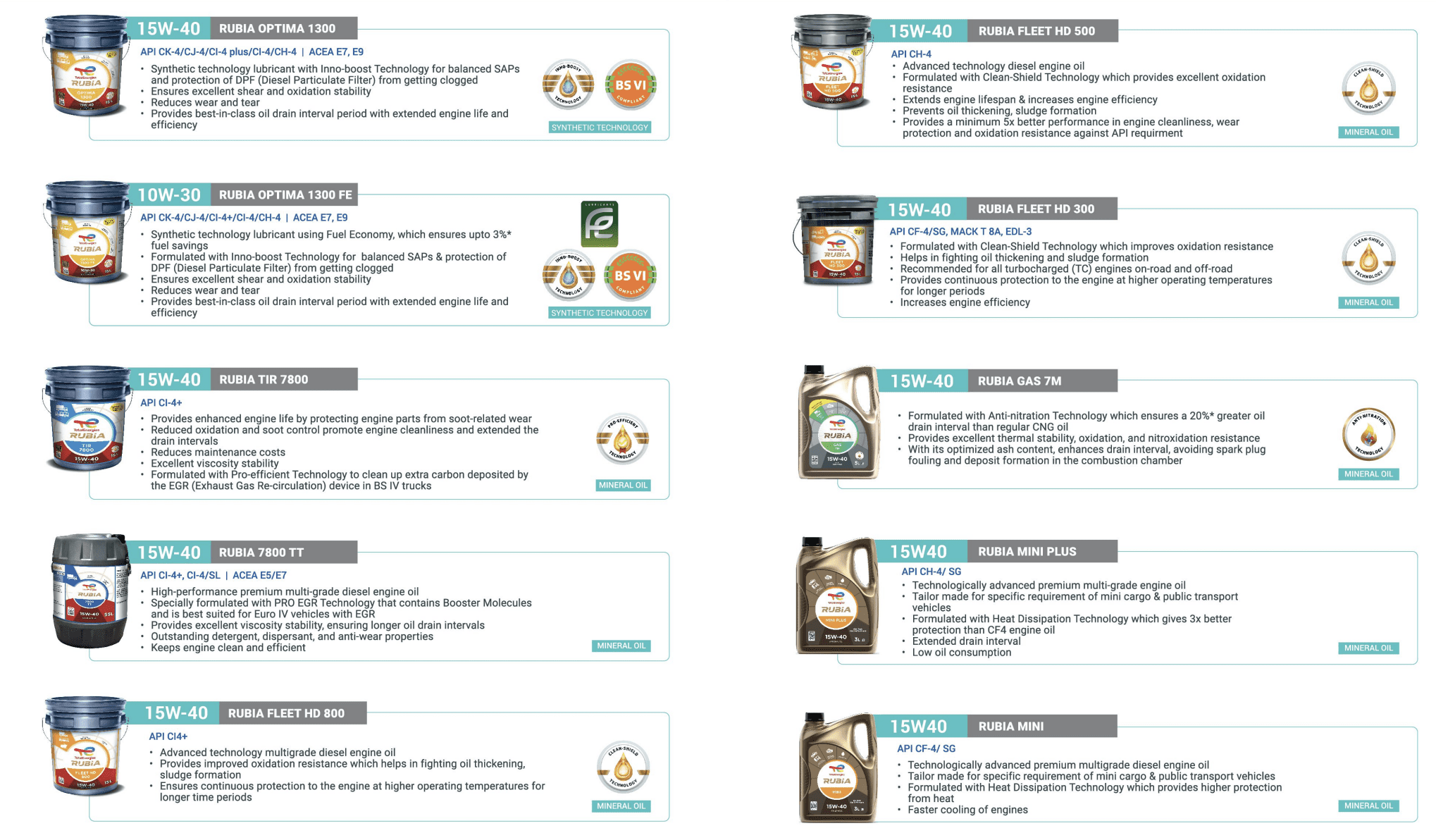 For commercial vehicles, fleets, and heavy-duty machinery, the RUBIA range provides robust performance under extreme operating conditions. These Heavy-Duty Engine Oils (HDEOs) are designed to maximize vehicle uptime and significantly reduce maintenance costs by extending oil drain intervals. RUBIA products are formulated with proprietary technologies like Inno-Boost and Pro-Efficient, which deliver outstanding engine cleanliness and superior resistance to oxidation. By maintaining a clean, lubricated seal and minimizing oil consumption, the RUBIA line ensures high durability and optimal fuel economy for trucks, buses, and off-road vehicles compliant with the latest engine generations, including BS VI and Euro VI standards.